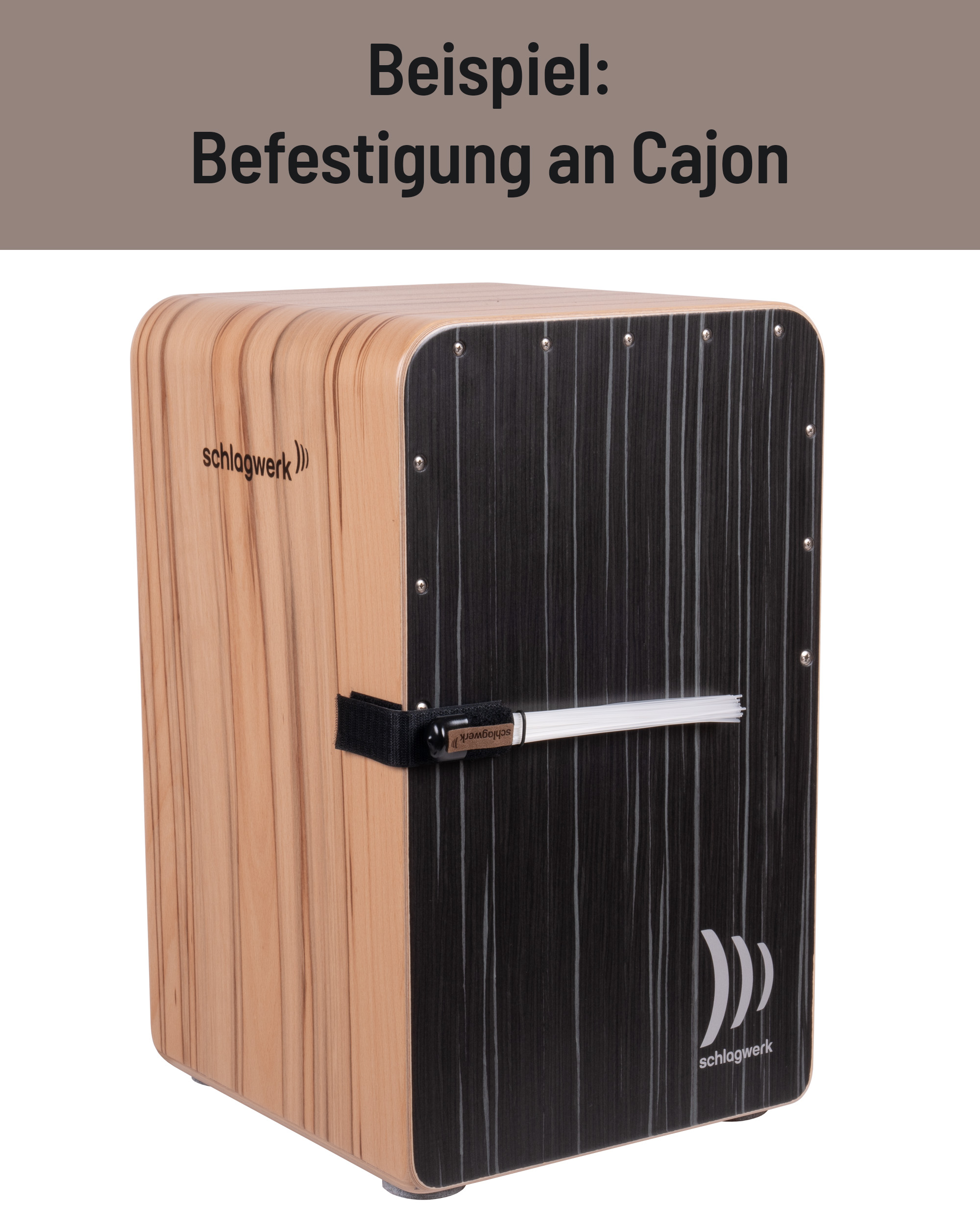 Der montierbare Brush ist nicht nur für Cajons / Rahmentrommel geeignet, sondern lässt sich an fast jedem Instrument an der Kante zur Schlagfläche platzieren. Die feinen, runden Nylonstäbe sorgen für einen sehr warmen Punch. Durch die Klettbefestigung hat man die Hände frei, wenn man sie braucht. Der Brush lässt sich abnehmen und so auf bei anderen Instrumenten einsetzen.