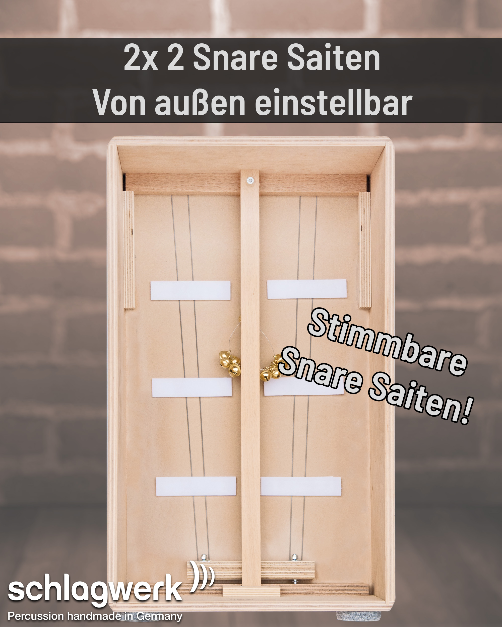 Im Inneren befinden sich 2x 2 Snare-Saiten, die von außen (somit kein "rumwurschteln" durch das Schallloch nötig) mit Hilfe des mitgelieferten Stimmschlüssels individuell auf die eigenen Soundvorstellungen angepasst werden können.
