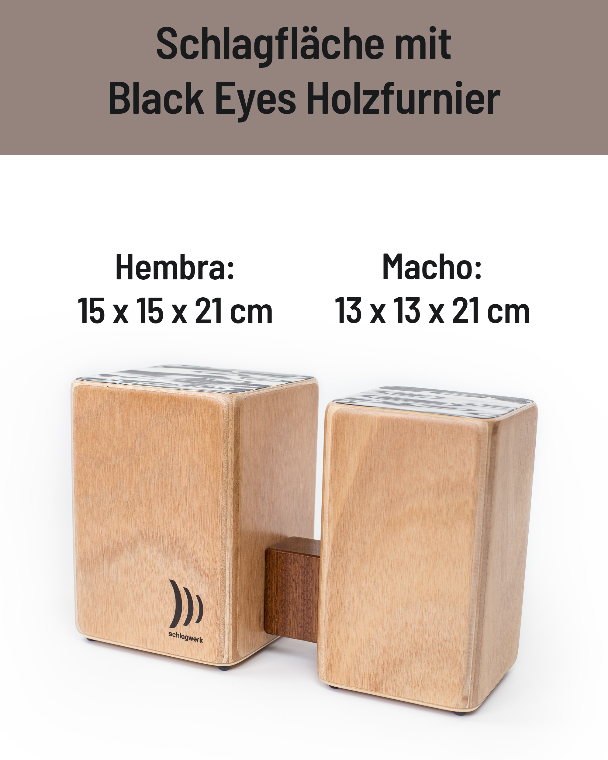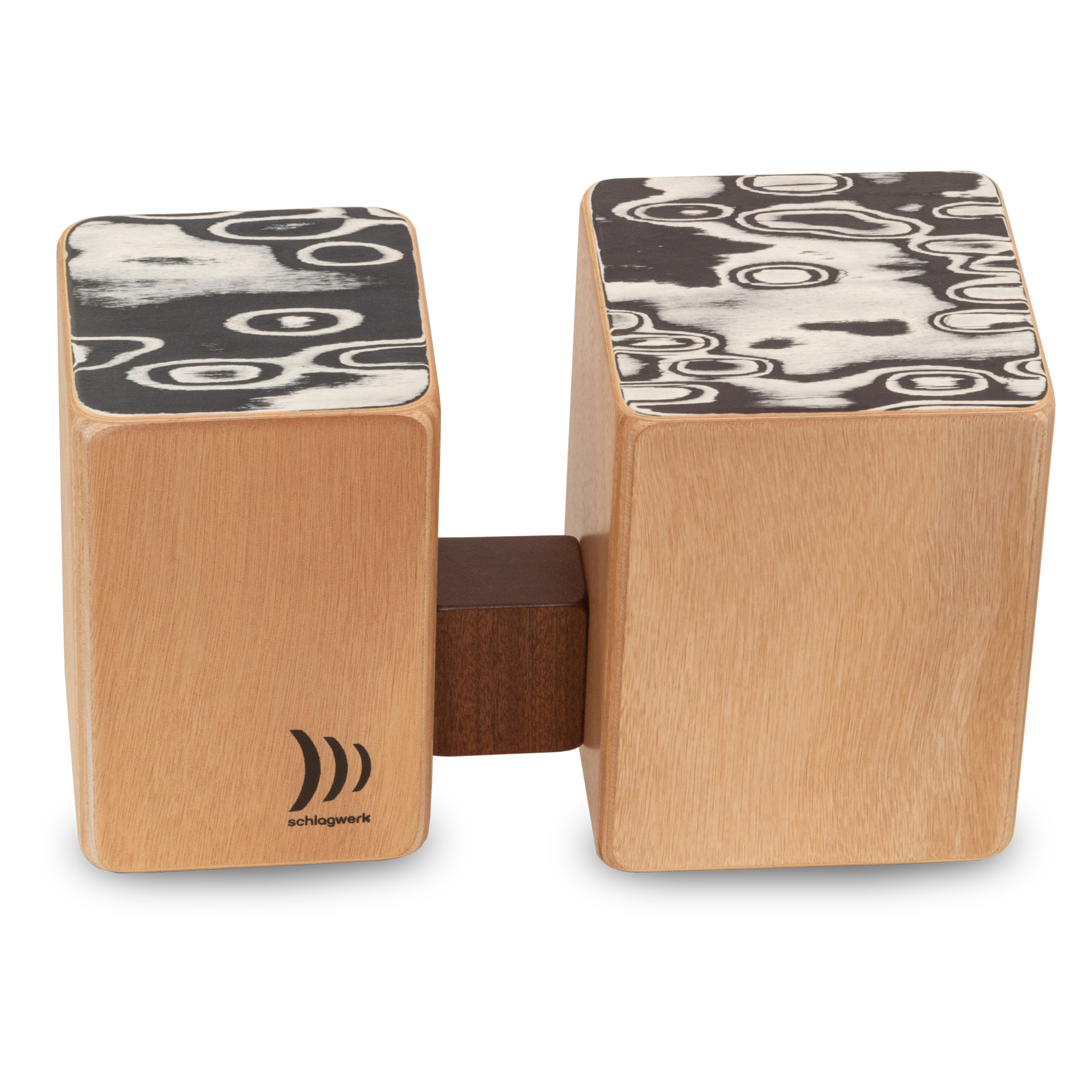 Die Schlagwerk Wooden Bongos WBM100 sind eine eigenständige Kombination zwischen Cajon und Bongoset. Die Wooden Bongos erlauben die gleiche Spieltechnik mit Fingern und Händen wie bei „normalen' Bongos. Belohnt wird der Spieler mit einem warmen, aber sehr durchsetzungs- starken Ton auf der Hembra (die größere der beiden Trommeln) – während der Macho sich spielend solistisch durchsetzen kann. Die Wooden Bongos sind witterungsunabhängig, müssen nicht gestimmt werden und bieten zudem eine günstige Alternative zu handelsüblichen Bongosets.