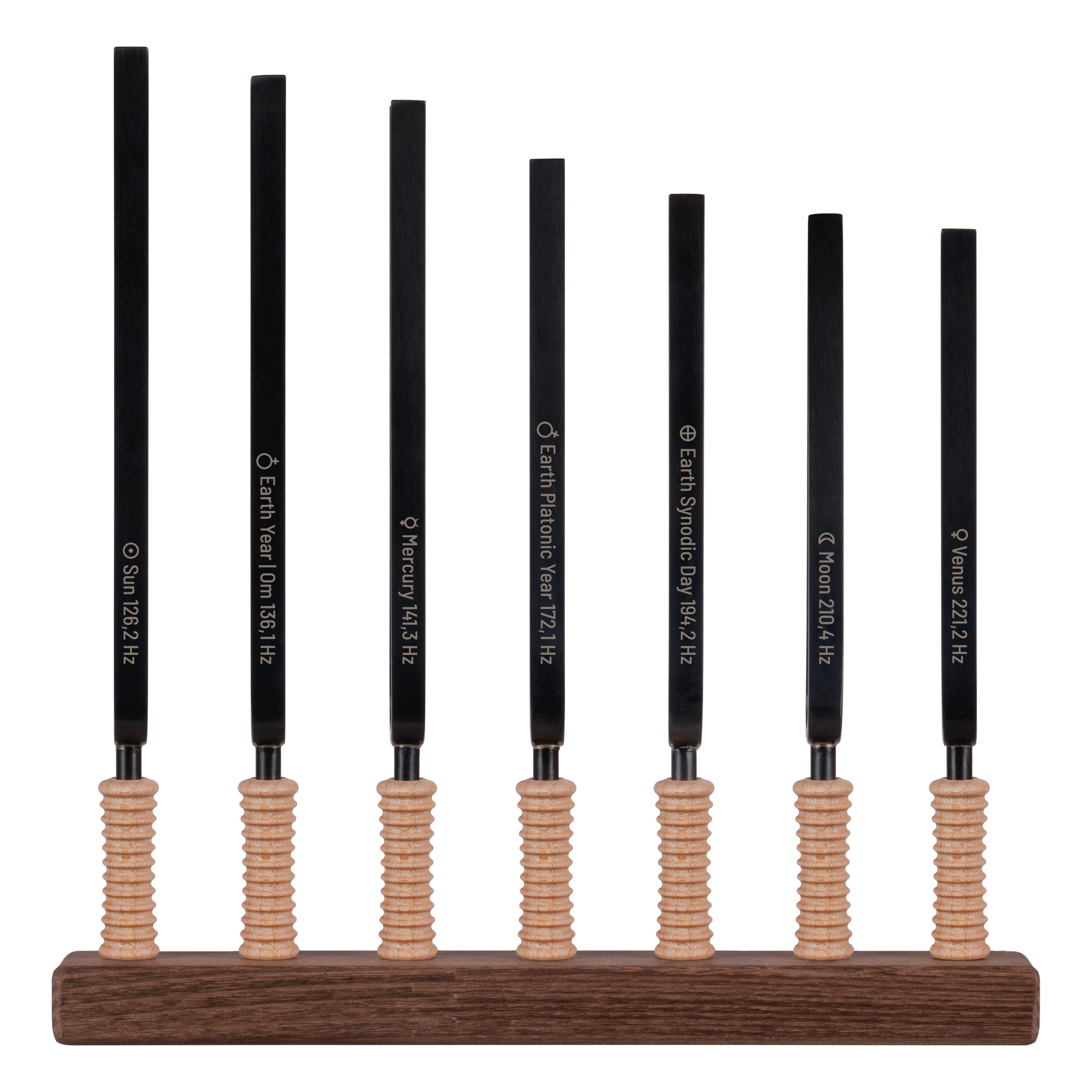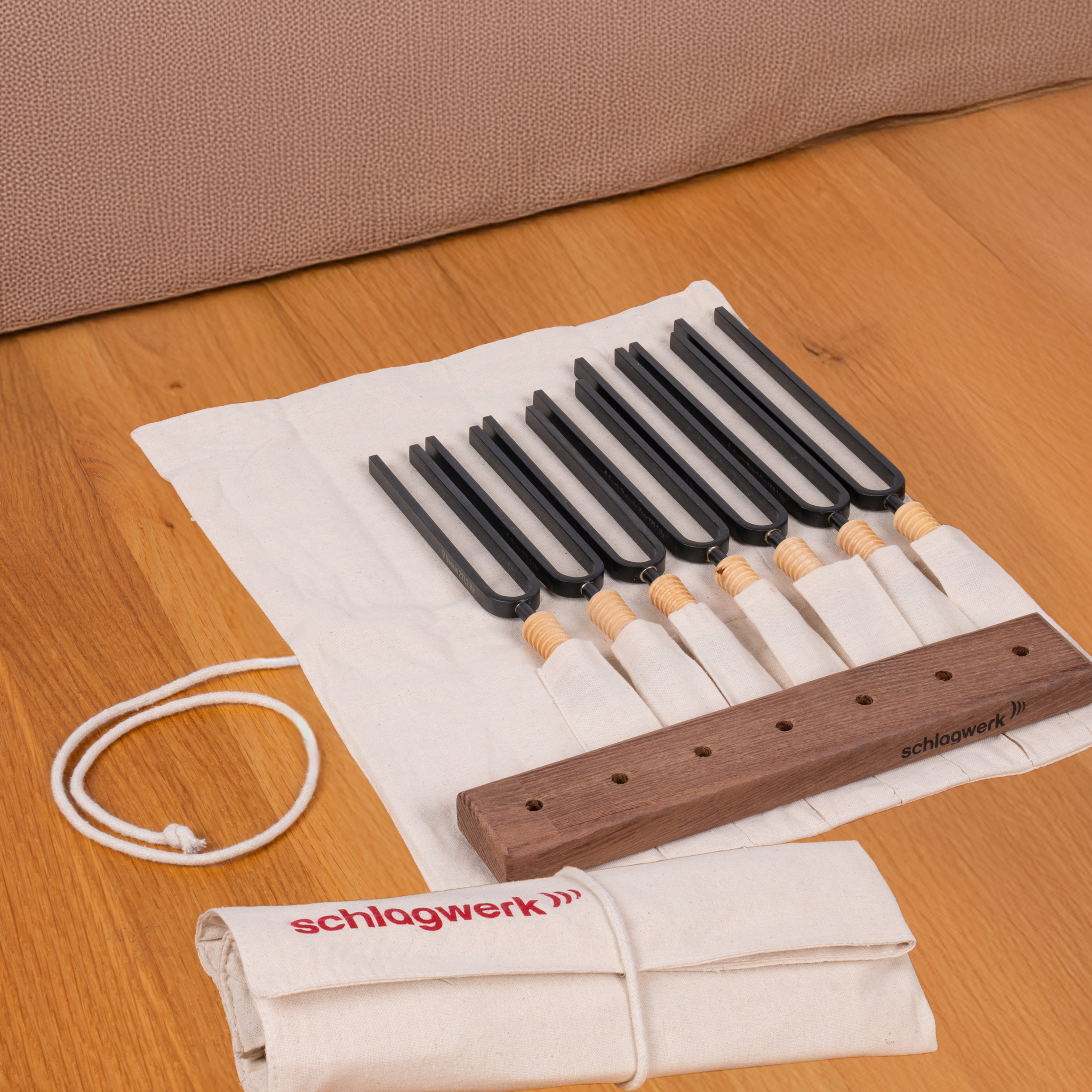 Das Set besteht aus den 7 Schlagwerk Einklang Stimmgabeln inklusive einem Ständer aus Holz und einem Transport Etui aus Baumwolle.