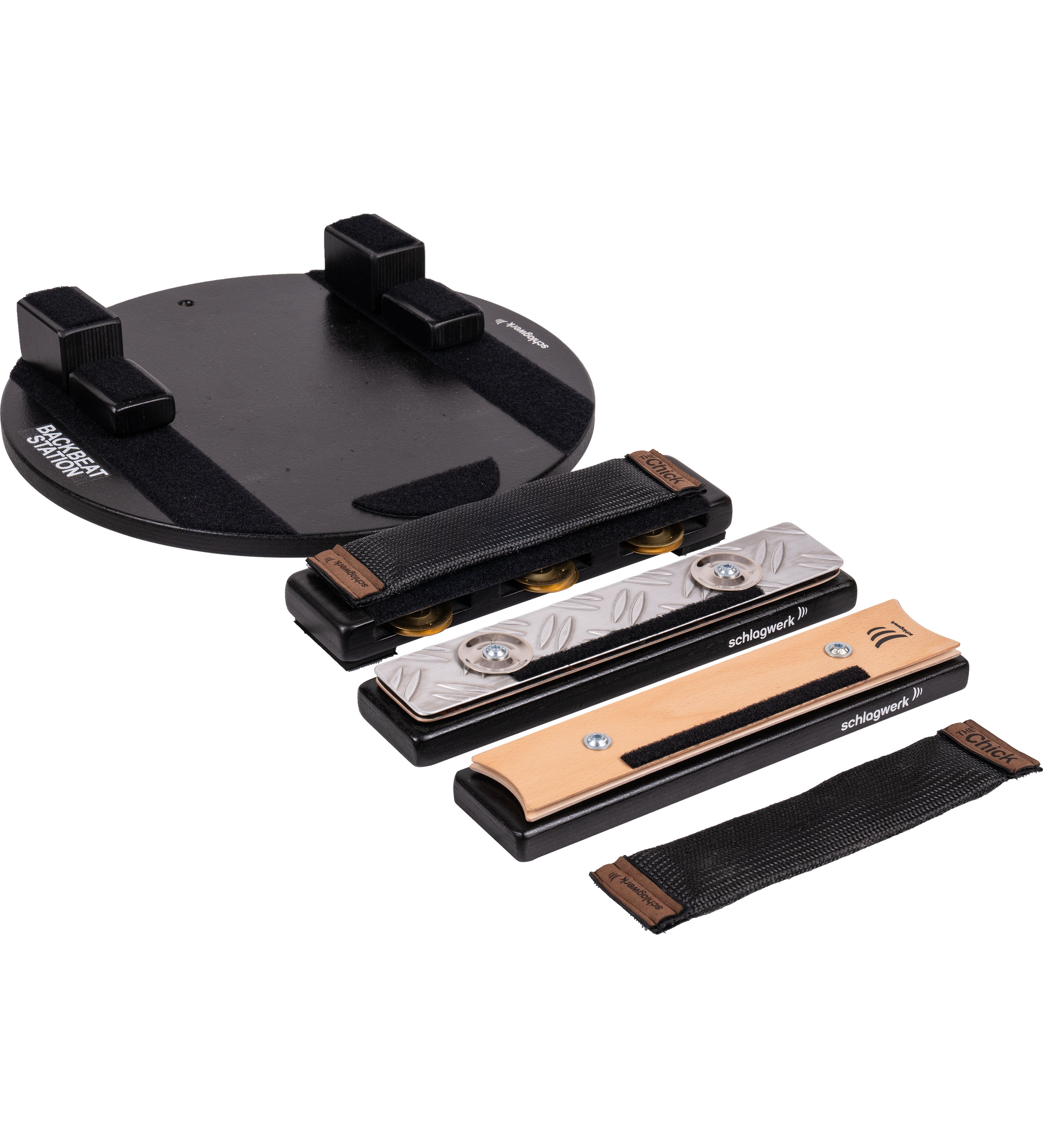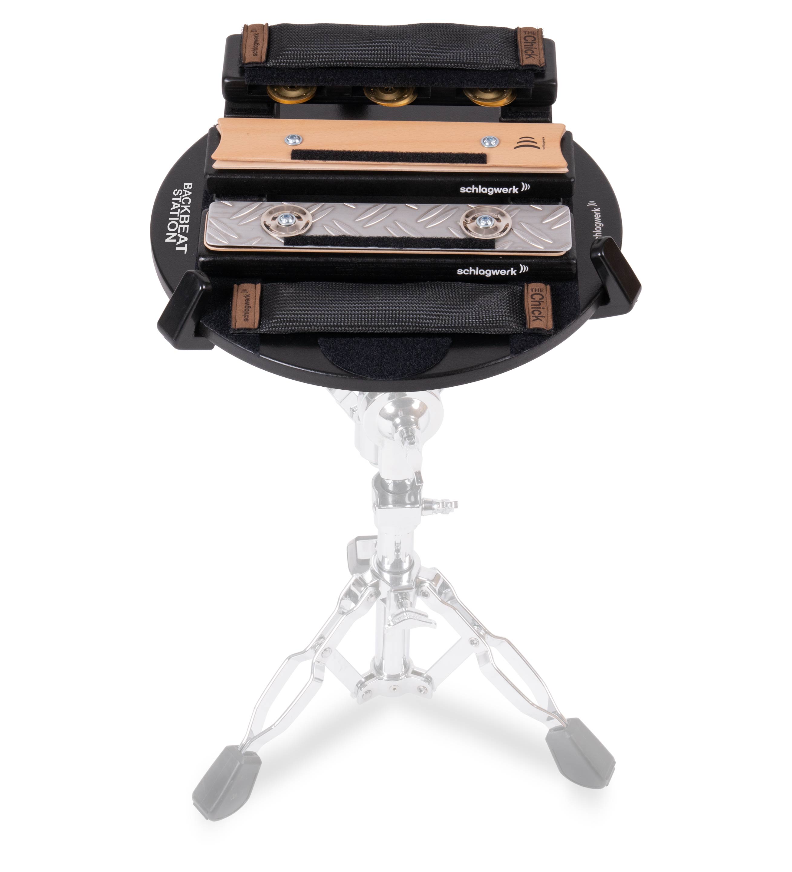 Mit der Backbeat Station Pro präsentieren wir eine ganze Spielwiese voller Effekte, die jedes Drumset durch innovative Backbeat-Sounds erweitert. Eine beflauschte Grundplatte aus Birkensperrholz, mit Ø 350mm bildet die Basis der Backbeat Station. Darauf können die verschiedenen Effekte beliebig platziert und versetzt werden. Zwei Klotzpaare unter den hinteren Effekten heben diese an und verbessern die Ergonomie beim Spielen. Die Grundplatte lässt sich auf jedem handelsüblichen Snare Stativ oder auf einer 14“ Snare platzieren und so perfekt im Drumset integrieren. Wer noch mehr anpassen möchte, kann die Grundplatte mit weiteren Effekten und Zubehör erweitern, um ein maßgeschneidertes Setup zu erstellen.