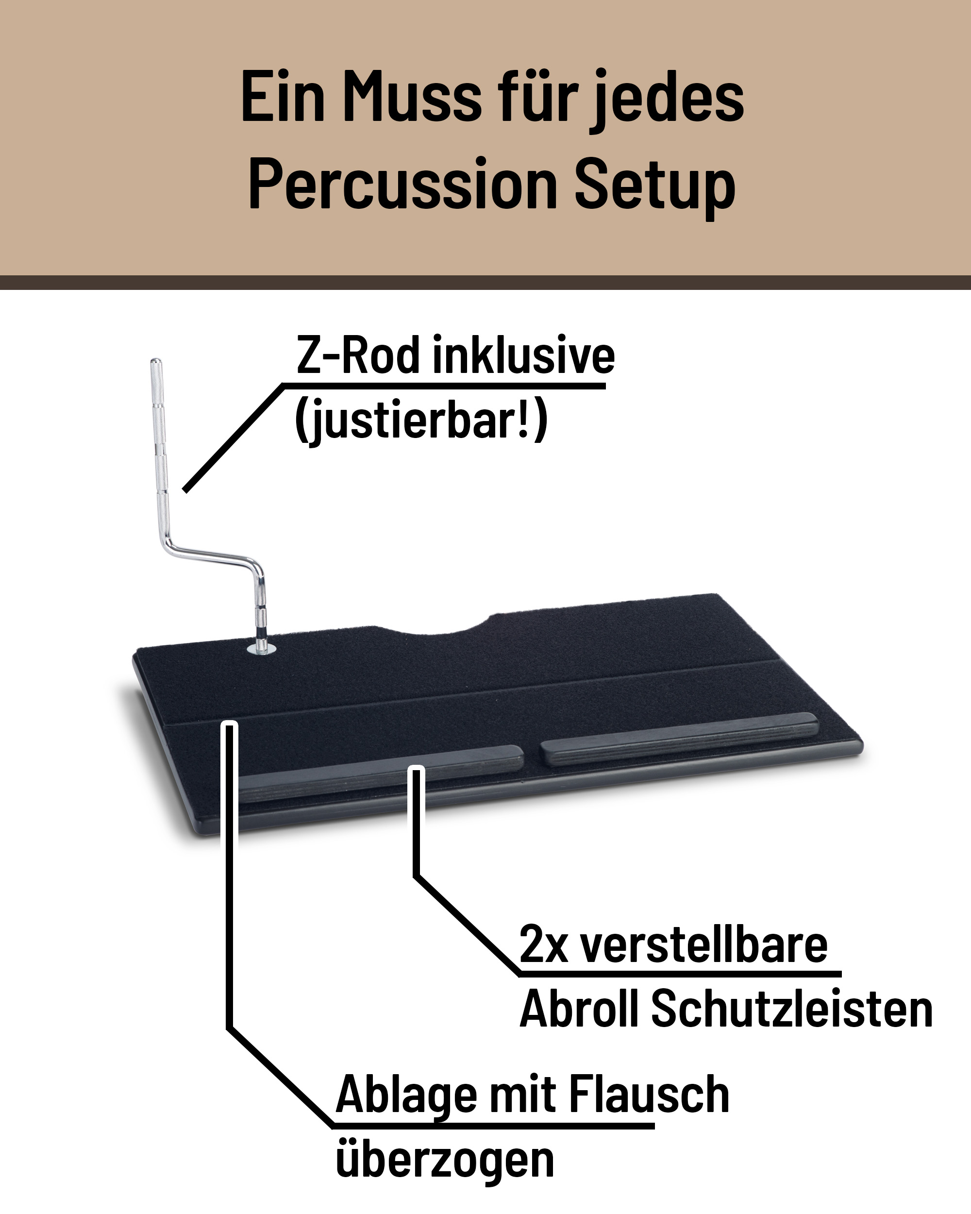 Wie praktisch ist das denn!! Einfach das Percussion Board auf einen Snareständer stellen und fertig ist der Percussion-Tisch für den Cajon Spieler. Dank der geräuschreduzierenden und flauschigen Grundfläche können diverse Add Ons mit Klett positioniert werden. Versetzbare Leisten verhindern ungewolltes Wegrollen von Rods oder Brushes. Zudem bietet der Z-Rod zahlreiche Positionierungsmöglichkeiten zur Montage von z.B. Cowbells, Tambourin oder Woodblocks.